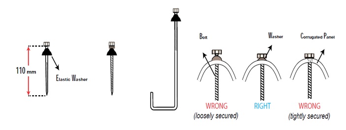 جهت بستن ورق به تیرها می توان از قلاب یا پیچ ( پیچ خودکار ) استفاده کرد . پیچ یا قلاب باید از روی موج 2 و 6 به روی تیر متصل شود . پیچها و قلابها باید از جنس گالوانیزه باشد تا دچار زنگ زدگی نشود . واشرهای پیچ یا قلاب باید از جنس الاستیک و قابل ارتجاع و کشسانی باشد . سفت شدن پیچ باید در حدی باشد که بعد از لمس پیچ یا مهره به روی ورق یک دور کامل به عکس گردانده شود تا شل گردد . میزان سفتی پیچ در زمان استفاده از پیچ خودکار باید بسیار مورد دقت واقع شود تا در اثر فشار بیش از حد ، ورقها در حین نصب یا مرور زمان دچار آسیب نگردند .